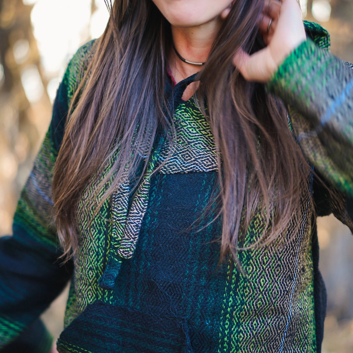 Hippies.com gives back to the community by sourcing all of our products straight from weavers in Mexico. By maintaining close relationships with our partners in Mexico, we work together to bring a unique piece of their culture back to the US. We do our best to protect the environment by using only recycled materials, limiting our carbon footprint as much as possible. Our Mexican hoodies have a V-neck with ties in the front, a deep front pocket and long sleeve.
